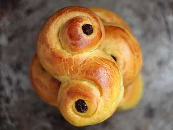 Lussekatt (gâteau mangé au cours des fêtes de Ste Lucie) https://fr.wikipedia.org/wiki/Lussekatt