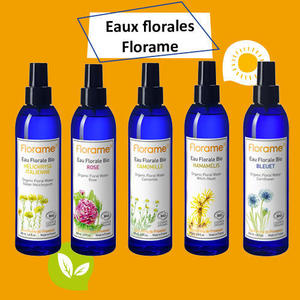 Photo des 5 eaux florales ou hydrolat Biocoop (rose, bleuet, fleur d’oranger, etc..)